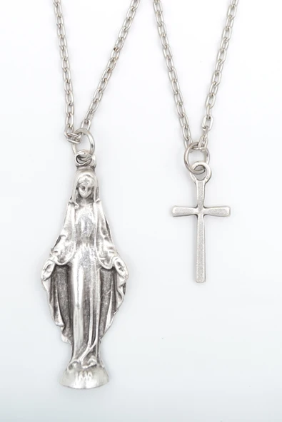 2'li Minimal Haç - Meryem Ana Gümüş Kaplama Kolye Seti