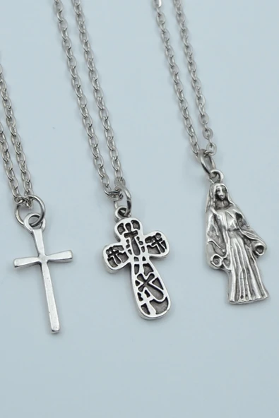 3'lü Minimal Haç Meryem Ana Gümüş Kaplama Kolye Seti