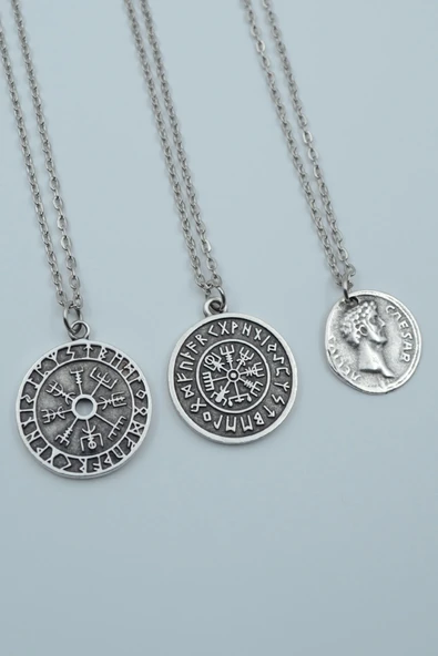 3'lü Viking Pusula Tılsım Sezar Sikke - Caesar Gümüş Kaplama Kolye Seti