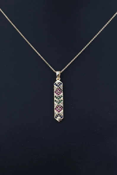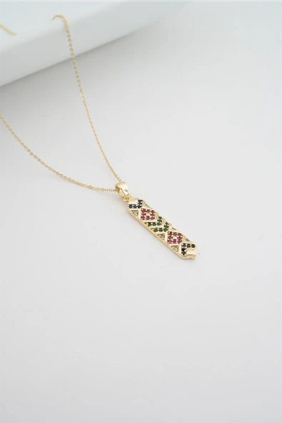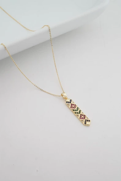 Kadın Renkli Vintage :Kilim Desenli Zirkon Taşlı Kolye
