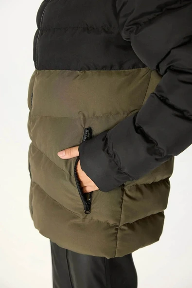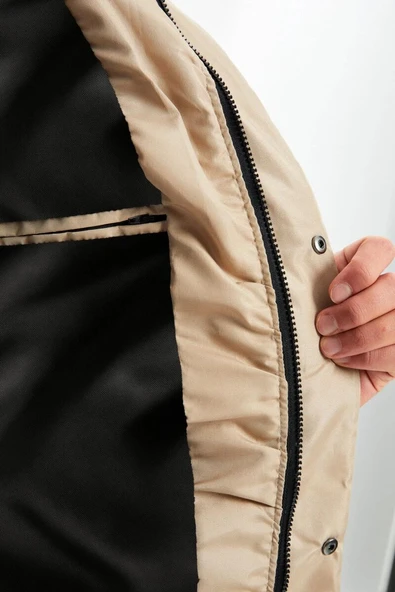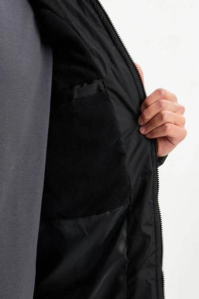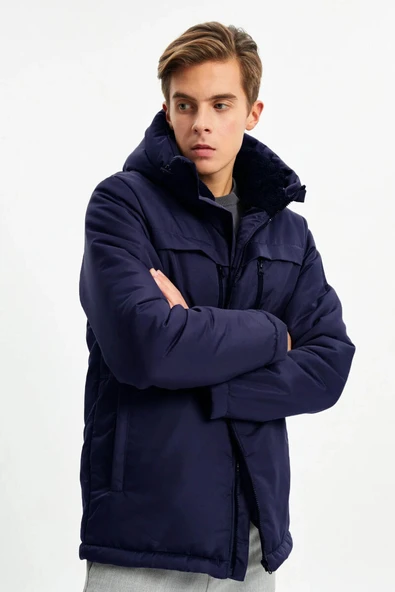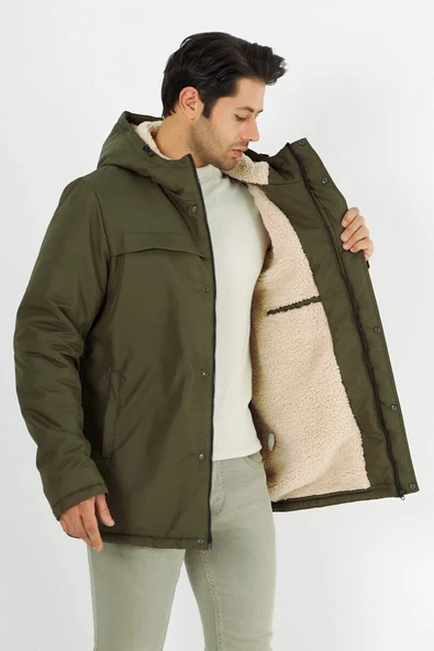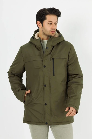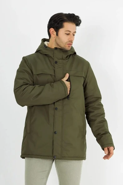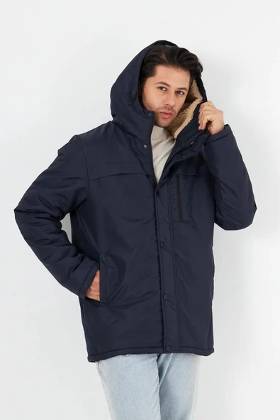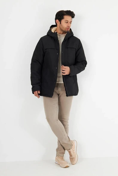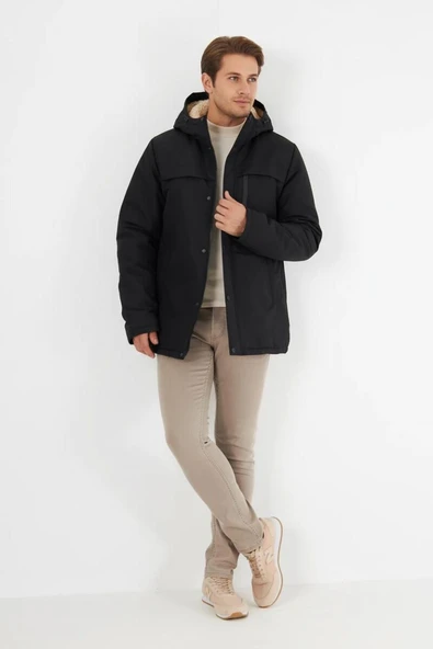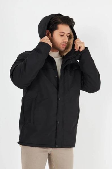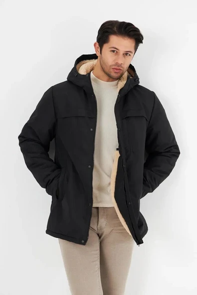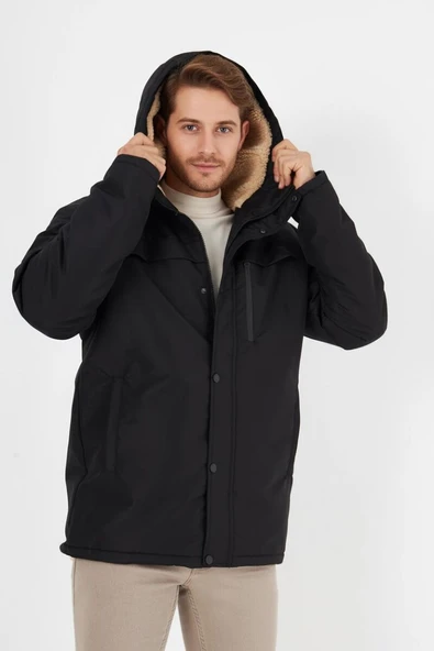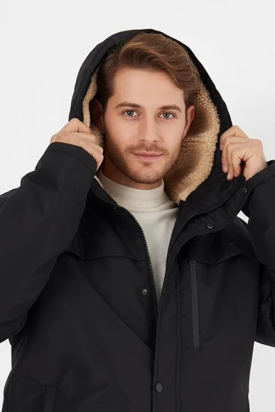 İçi Kürklü Su ve Rüzgar Geçirmez Cepli Kapüşonlu Erkek Mont