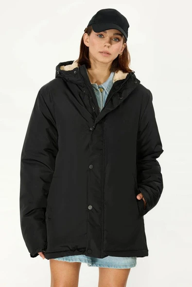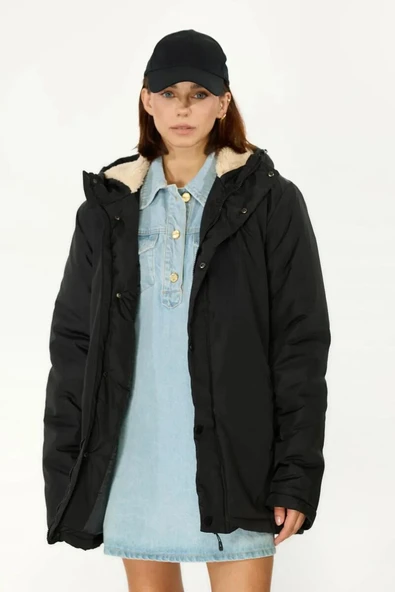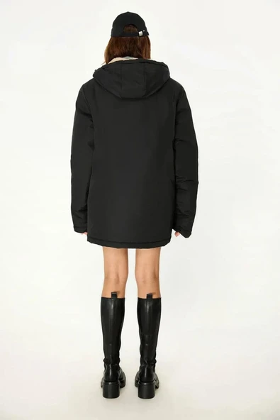 İçi Kürklü Su ve Rüzgar Geçirmez Cepli Kapüşonlu Kadın Mont