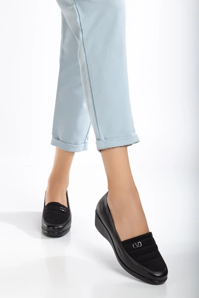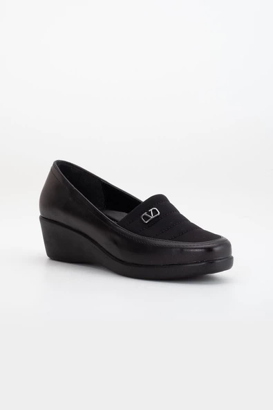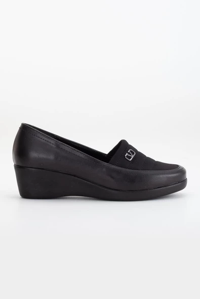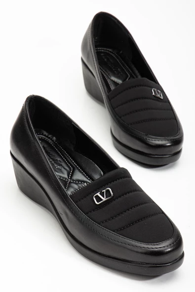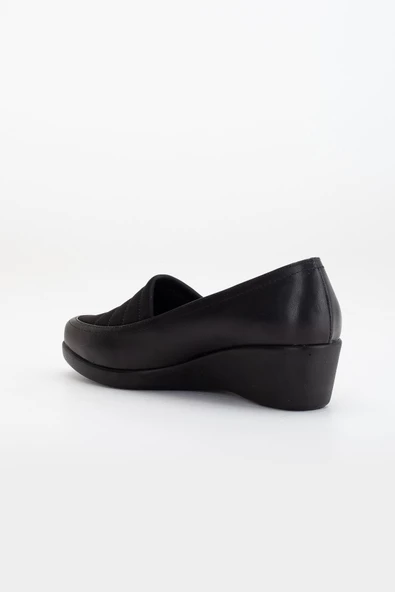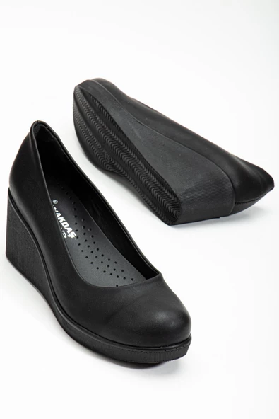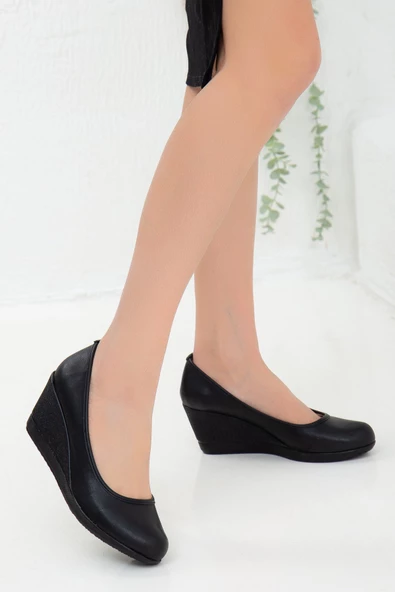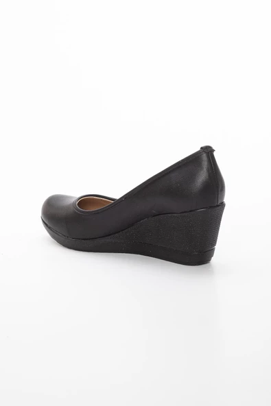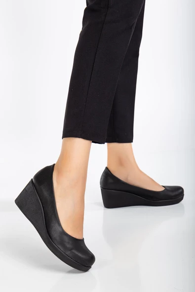 Dolgu Taban Suni Deri Ortopedik Siyah Kadın Dolgu Topuklu Ayakkabı