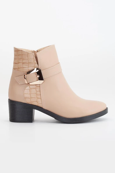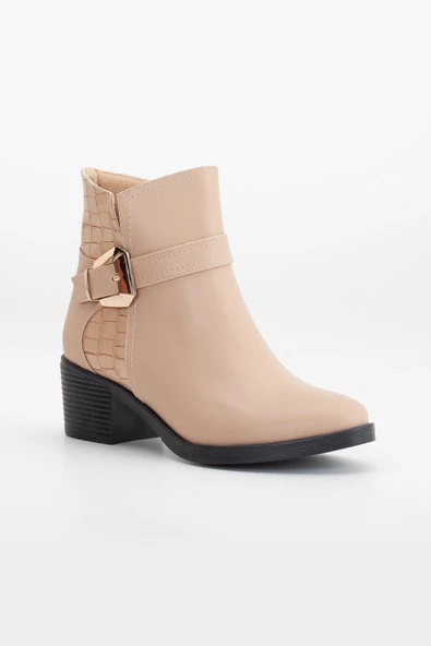 Kadın Topuklu Bot Günlük Bej Cilt Kroko Baskılı Kalın Topuklu