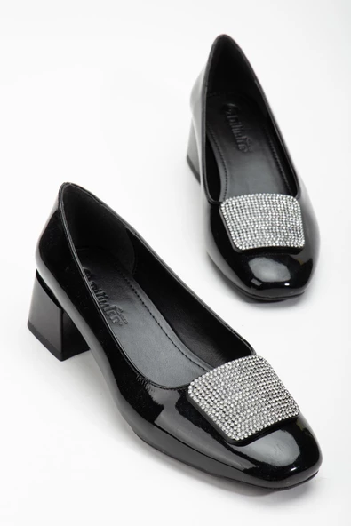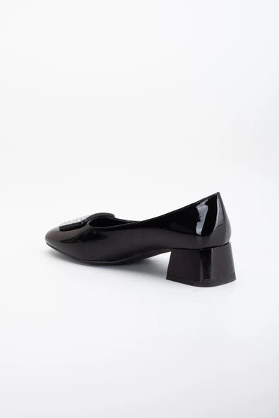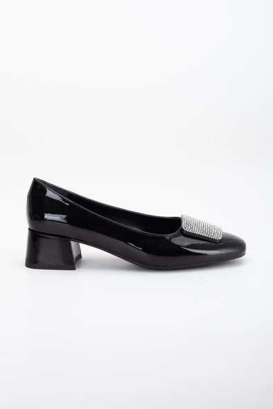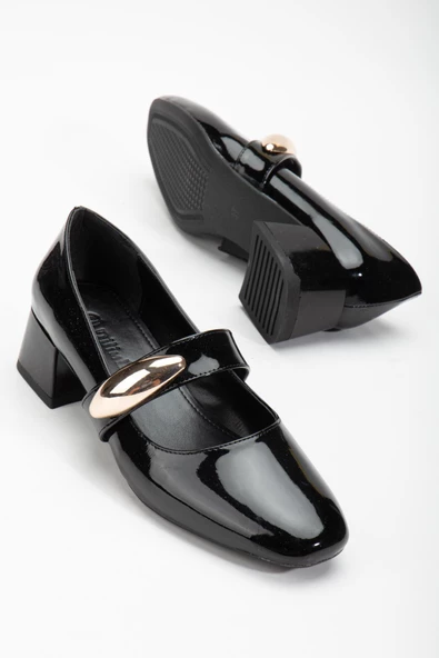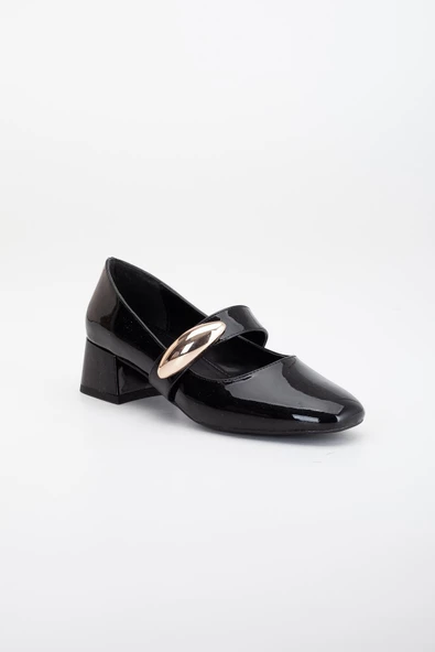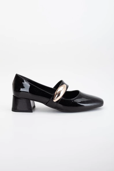 Büyük Numara Kadın Topuklu Ayakkabı Siyah Rugan Baretli Metal Tokalı