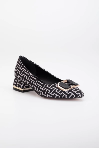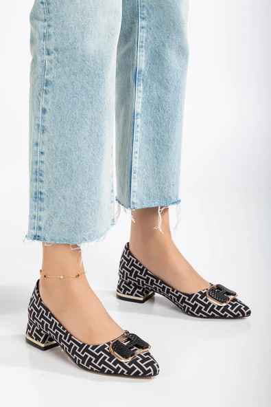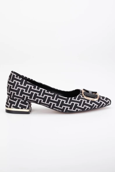 Kadın Topuklu Ayakkabı Siyah Çizgili Deri Galvanız Ökçe Tokalı