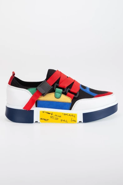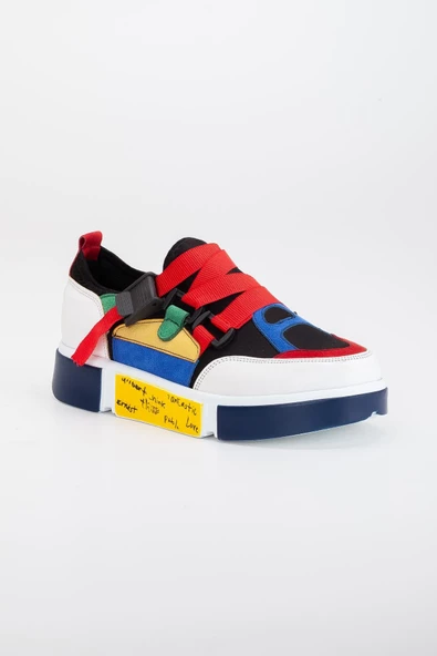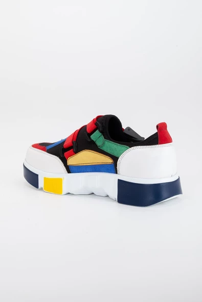 Kadın Spor Ayakkabı Beyaz Streç Süet Çok Renkli Kalın Taban