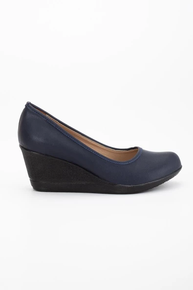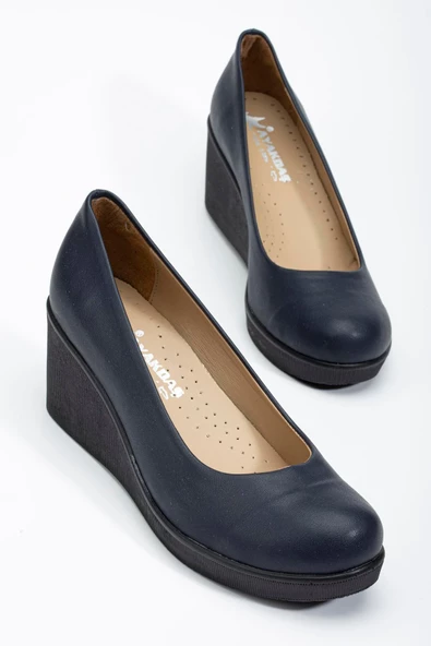 Dolgu Taban Suni Deri Ortopedik Lacivert Siyah Kadın Dolgu Topuklu Ayakkabı
