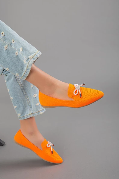 Triko Taş Detaylı Sivri Burun Turuncu Kadın Babet