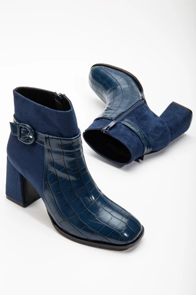 Süet ve Kroko Deri Küçük Kemerli Lacivert Kadın Kalın Topuklu Bot