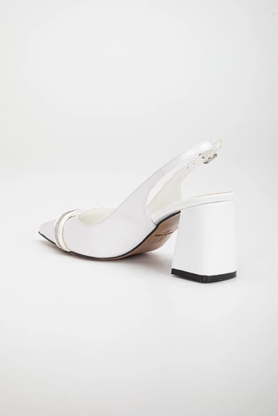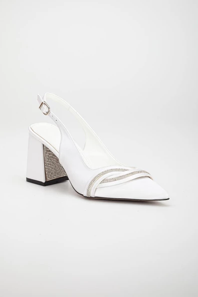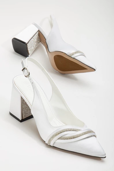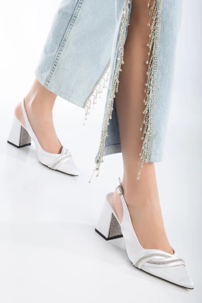Saten Baretli Taşlı Beyaz Büyük Numara Kadın Ayakkabı Topuklu Abiye