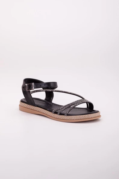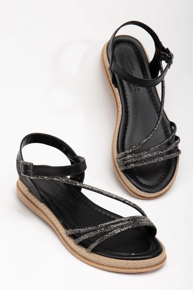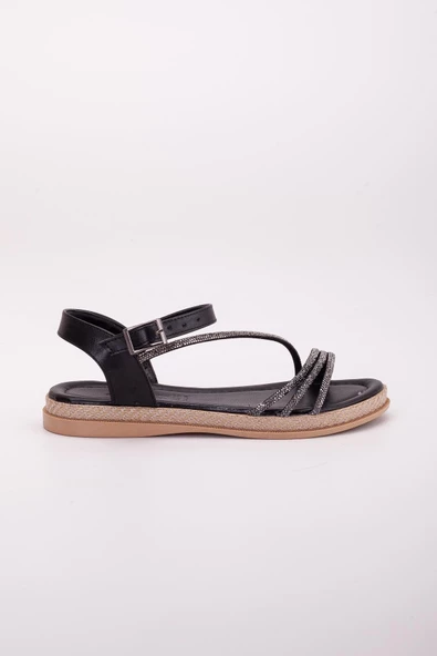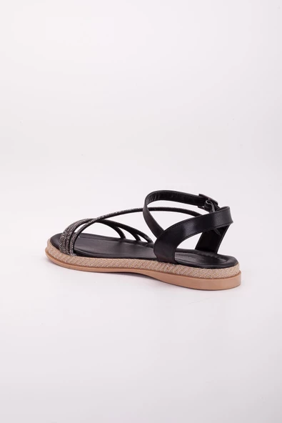 Jüt Sargılı İnce Taban Taş Bantlı Siyah Kadın Düz Topuklu Sandalet