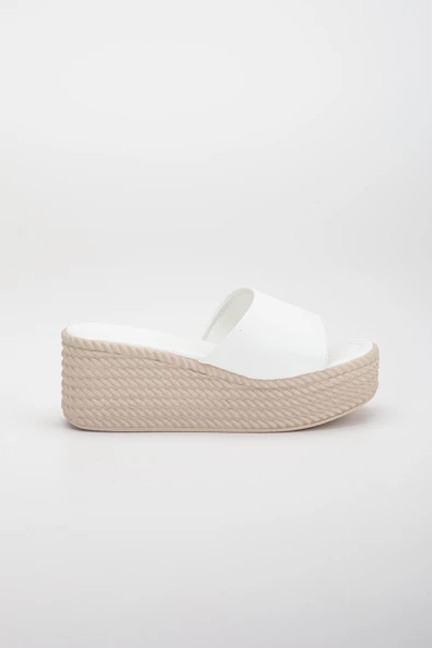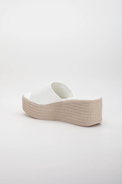 Hasır ve Düz Kalın Tekbant Beyaz Kadın Dolgu Topuklu Terlik