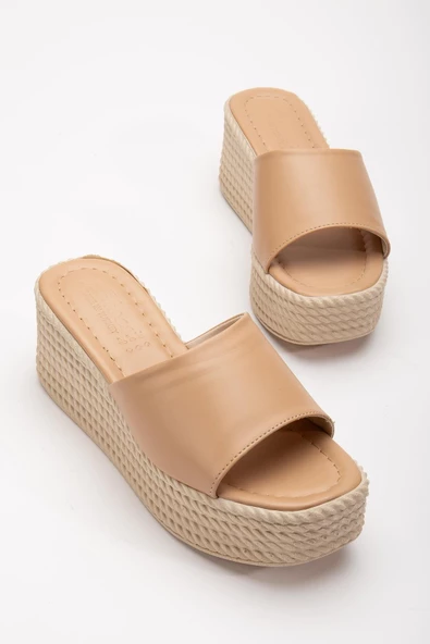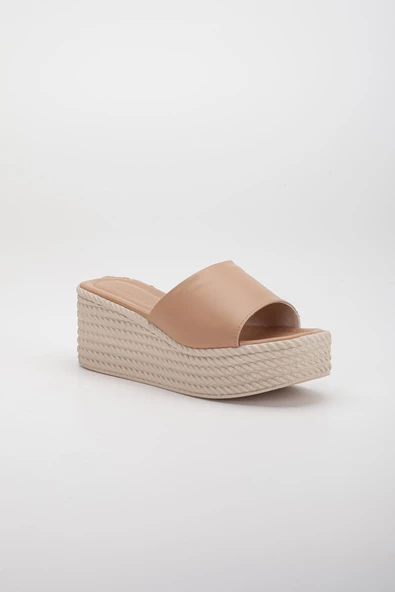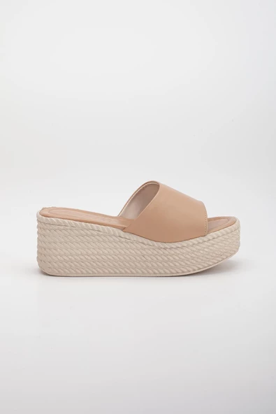Hasır ve Düz Kalın Tekbant Ten Kadın Dolgu Topuklu Terlik