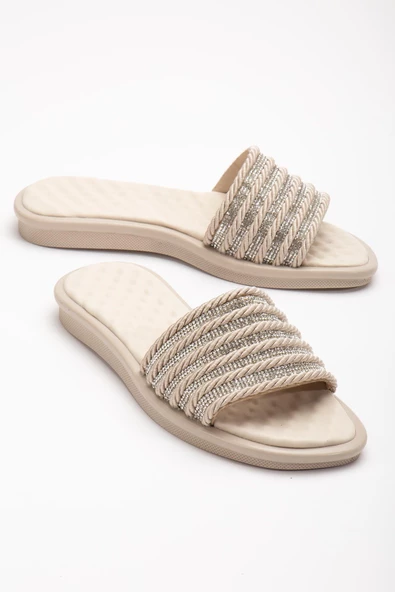 Örgü ve Taş Detaylı Bej Kadın Düz Taban Terlik