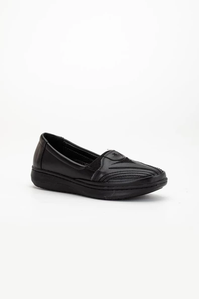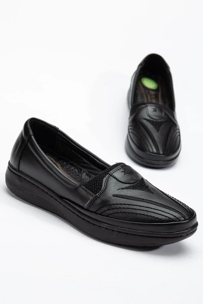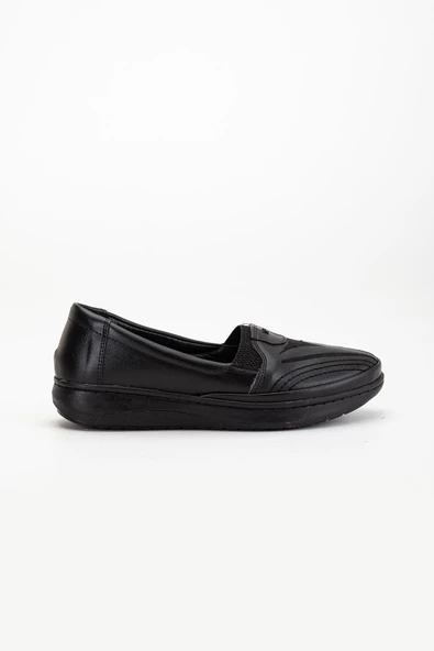 Büyük Numara Hakiki Deri Kadın Günlük Ortopedik Ayakkabı Siyah Yüzü Nakışlı