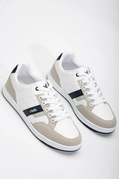 Erkek Spor Ayakkabı Beyaz Cilt Yan Şeritli Düz Taban