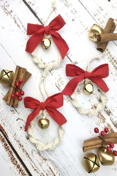 3lü Kırmızı Kurdeleli Makrome Zilli Halka - Dekoratif Süs - Yılbaşı Ağaç Süsü -