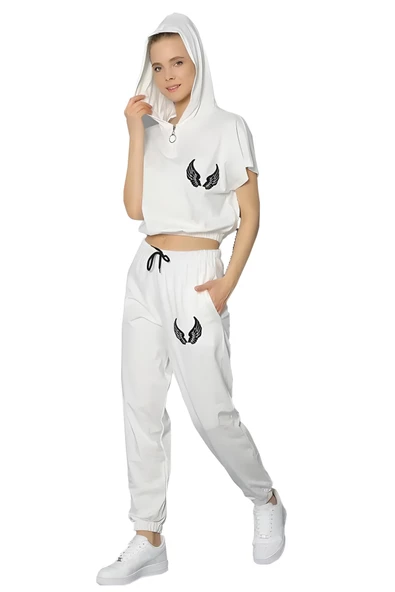 Bayan Kanat Baskılı Krop Kapüşonlu Eşofman Takımı - (5612)