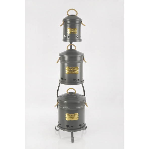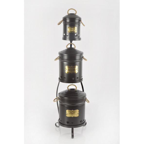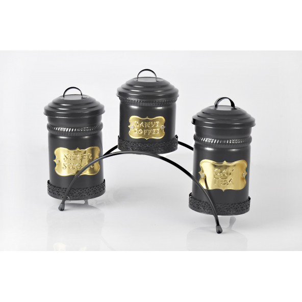 3lü Metal Köprü Standlı Galvaniz Siyah Çay Kahve Şeker Saklama Kutusu