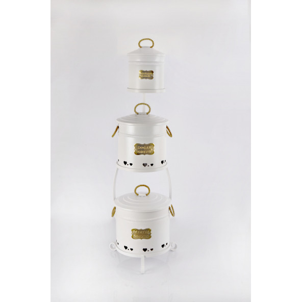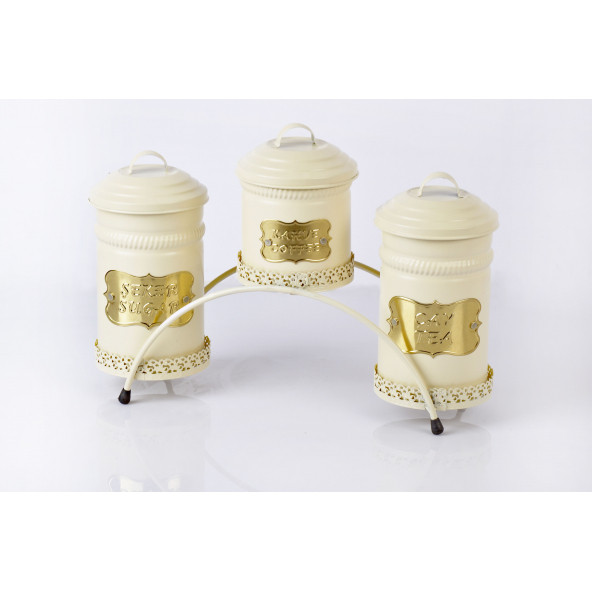 3lü Metal Köprü Standlı Galvaniz Krem Çay Kahve Şeker Saklama Kutusu