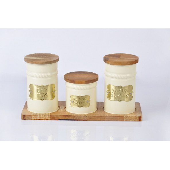 Ahşap Standlı Ahşap Kapaklı Krem 3lü Metal Galvaniz Çay Kahve Şeker Saklama Kutusu