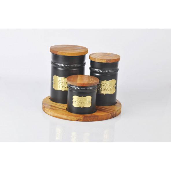 Yuvarlak Ahşap Standlı Ahşap Kapaklı Siyah 3lü Metal Galvaniz Çay Kahve Şeker Saklama Kutusu