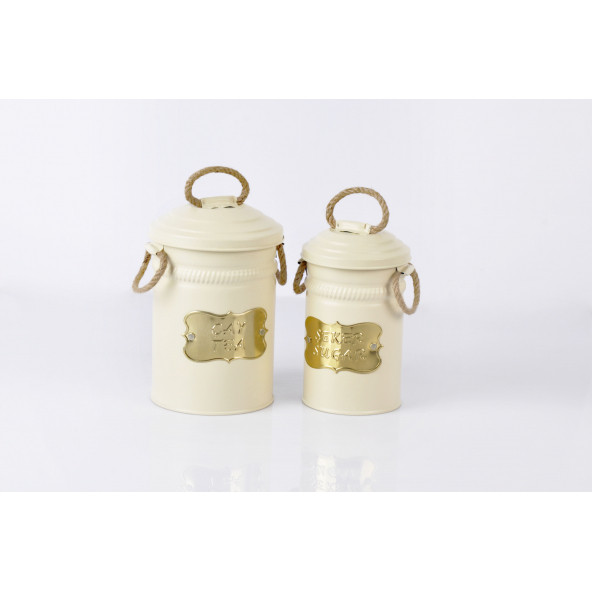 2li Galvaniz Hasır Kulplu Hasır İpli Krem Çay Şeker Saklama Kabı Kutusu