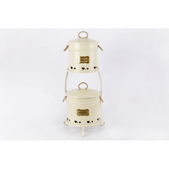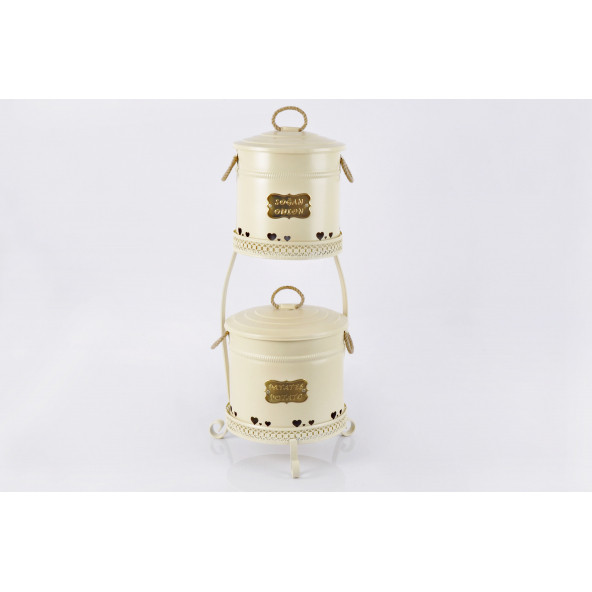 Galvaniz Dantel Desen Metal Standlı 2 Katlı Patates Soğan Kovası Krem 1051