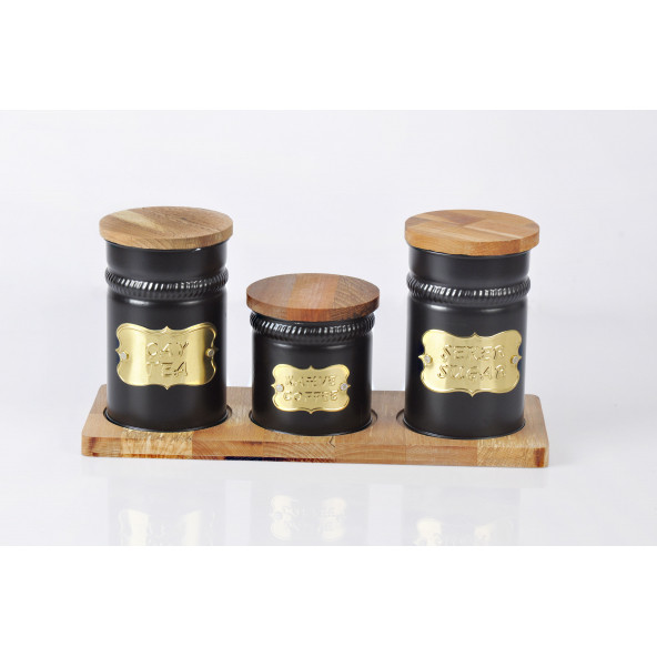 Ahşap Standlı Ahşap Kapaklı Siyah 3lü Metal Galvaniz Çay Kahve Şeker Saklama Kutusu