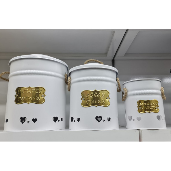 3lü Beyaz Ferforje Patates Soğan Sarımsak Saklama Kutusu Kovası