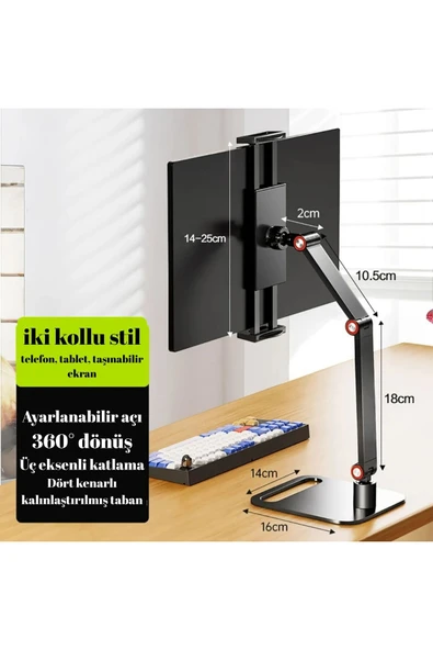 Evrensel Tablet,Telefon ve Monitör Standı-360° Döner Masa Üstü Ekran Tutucu-Metal Gövde