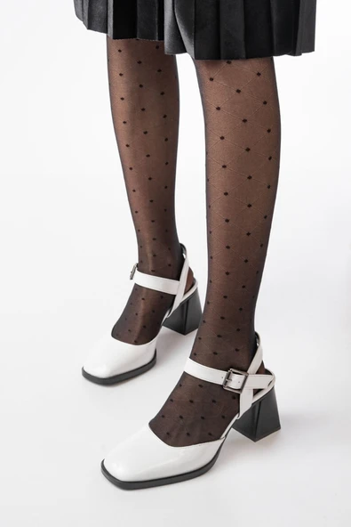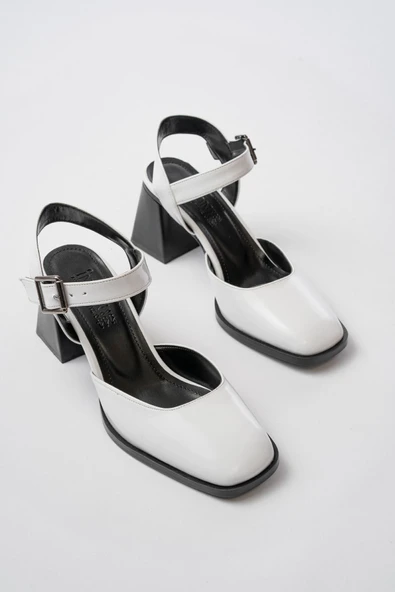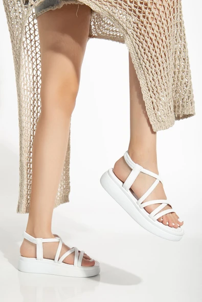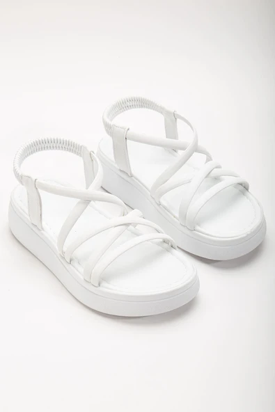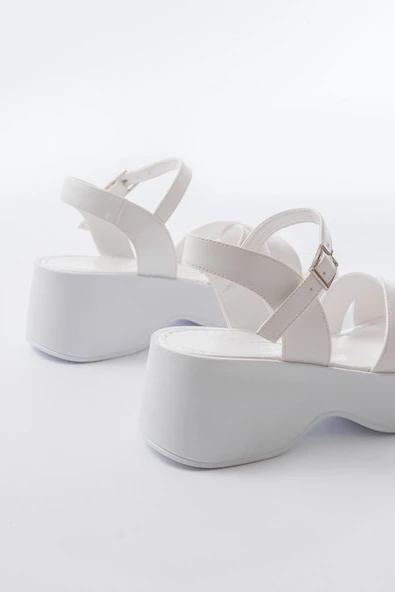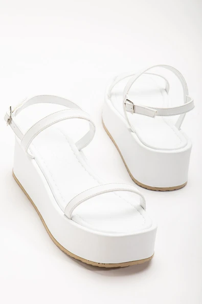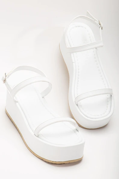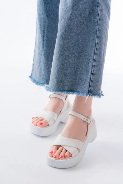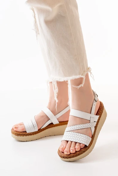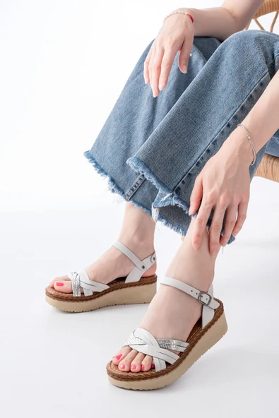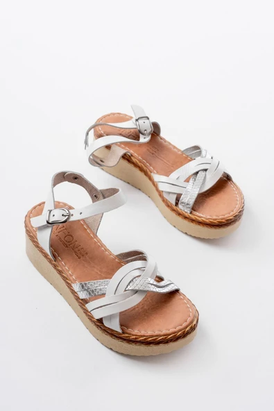 730-037 Beyaz Ayna Hakiki Deri Ortopedik Taban Kadın Sandalet