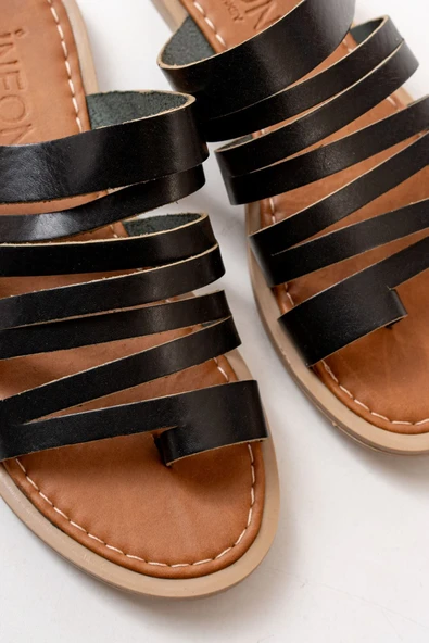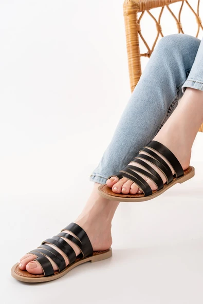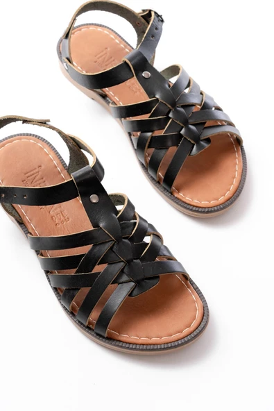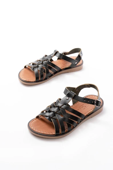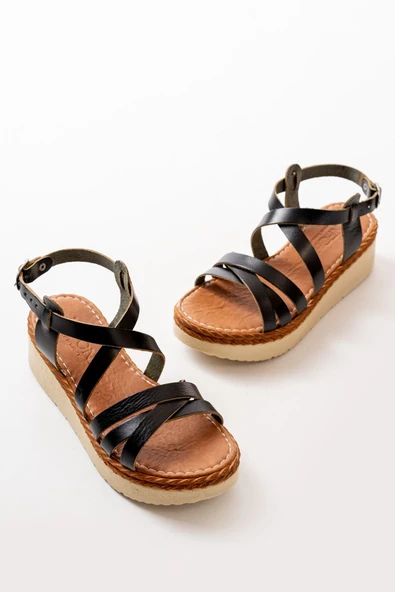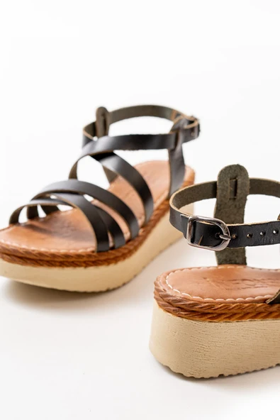205-208 Siyah Hakiki Deri Ortopedik Taban Kadın Sandalet