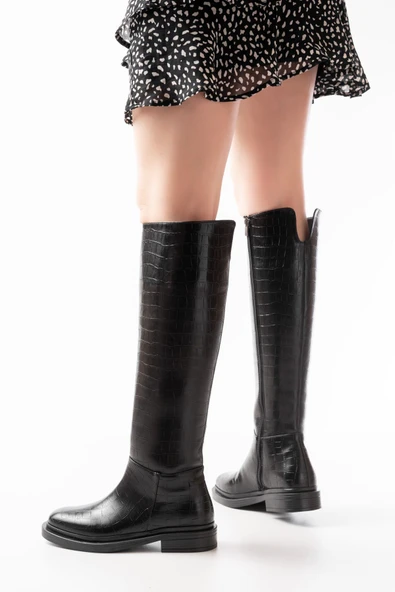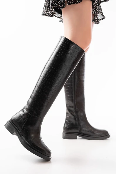 RS-2432 Siyah Kroko Topuklu Fermuarlı Günlük Kadın Çizme