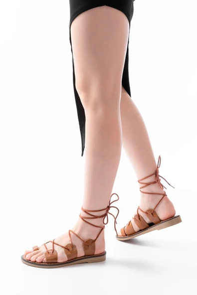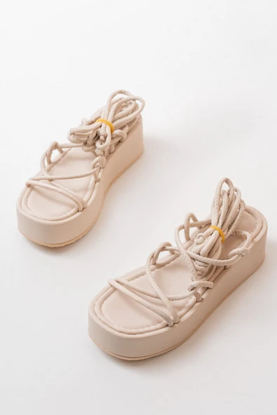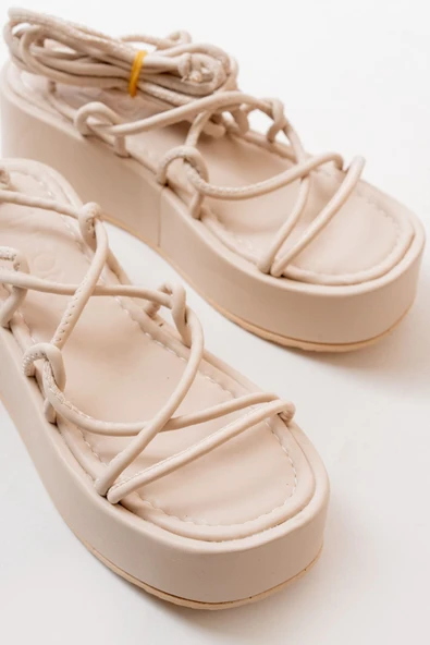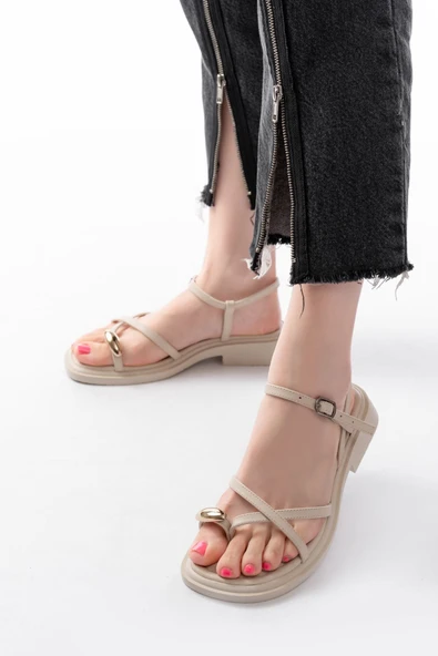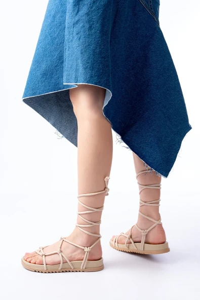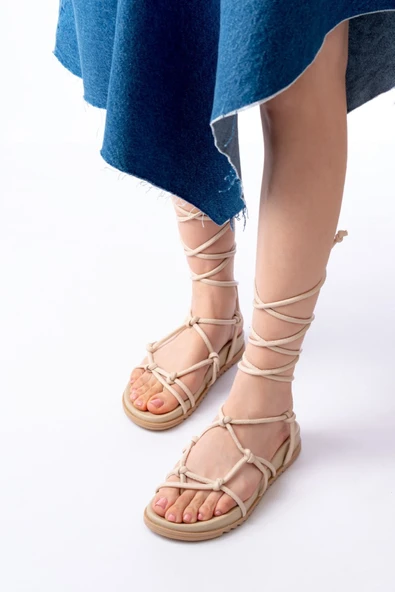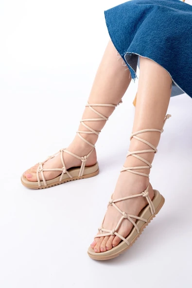 1001-1001 Bej Bilekten Bağcıklı Kadın Sandalet