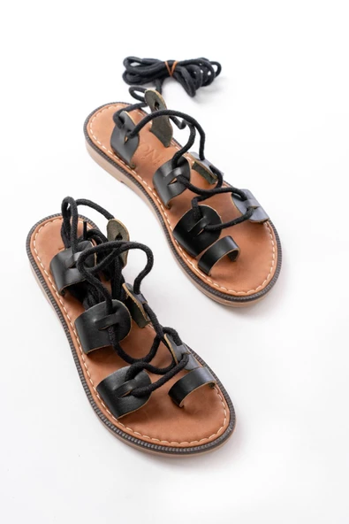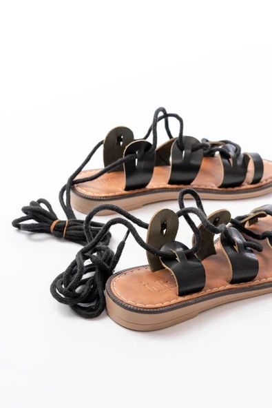 205-01 Siyah Bilekten Bağlamalı Ortopedik Hakiki Deri Kadın Sandalet