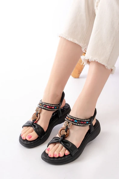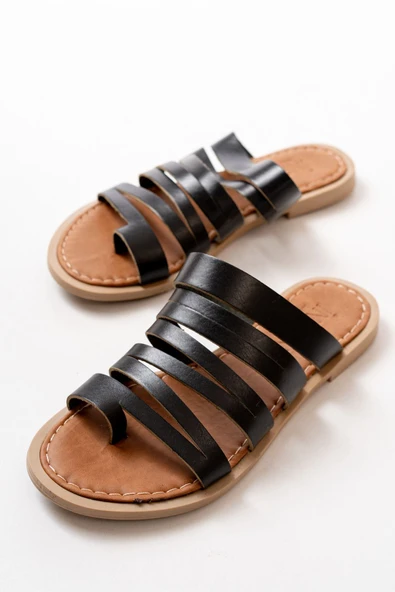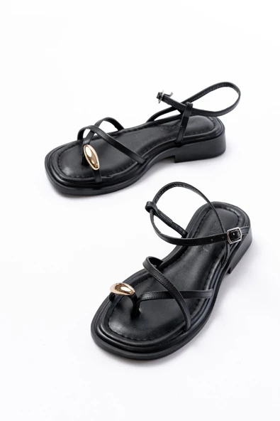 S-101 Siyah Parmak Arası Taş Detaylı Günlük Kadın Sandalet