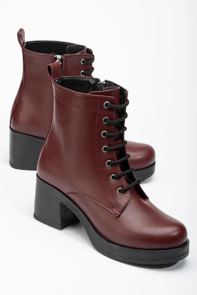 5109-3025 Bordo Bağcıklı Fermuarlı Kalın Topuklu Günlük Kadın Bot