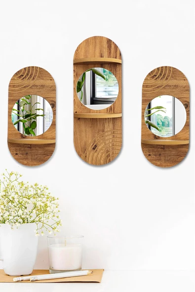 3 Lü Aynalı Duvar Rafı Seti Yuvarlak Ayna Dekoratif Ahşap Duvar Rafı Seti - 016p