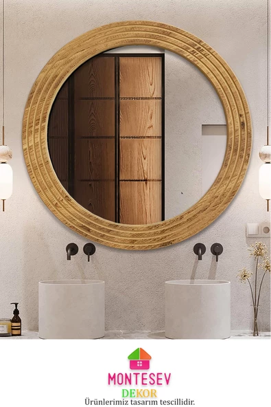 Antik Ahşap Dekoratif Ayna Yuvarlak Ayna Duvar Aynası Banyo Lavabo Aynası - 56 Cm
