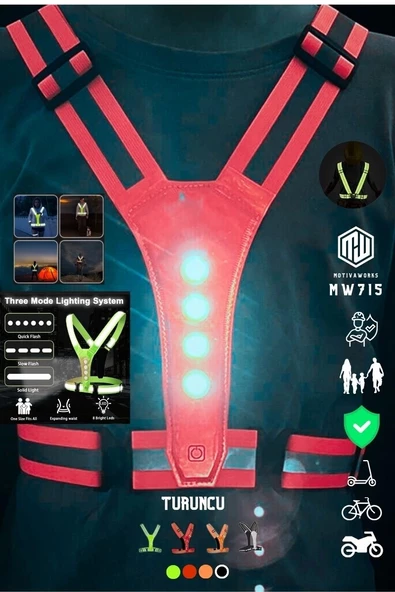 Reflektif Işıklı Yelek Turuncu Fosforlu Neon Bisiklet, Motosiklet,Scooter Gece İkaz Uyarı Yeleği