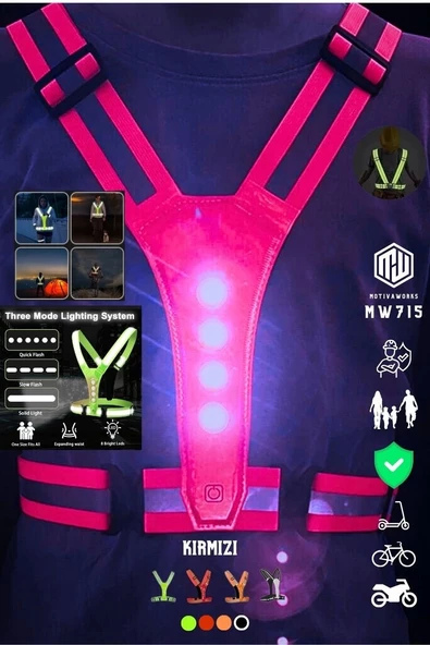 Reflektif Işıklı Yelek Kırmızı Fosforlu Neon Bisiklet, Motosiklet,Scooter Gece İkaz Uyarı Yeleği