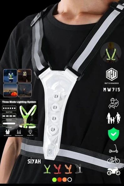 Reflektif Işıklı Yelek Siyah Fosforlu Neon Bisiklet, Motosiklet,Scooter Gece İkaz Uyarı Yeleği