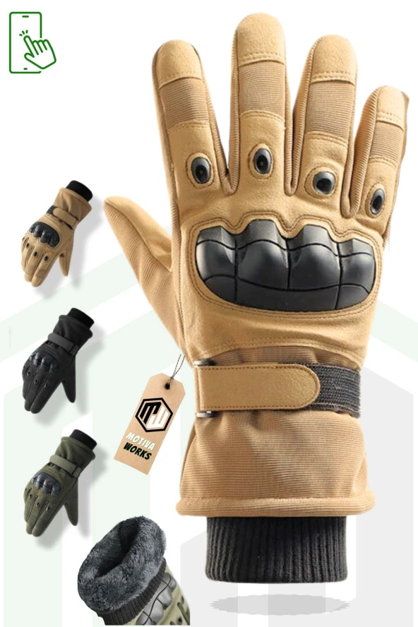 Soğuk Hava Motosiklet Eldiven Haki Yeşil Kışlık Içi Tüylü Bilekli Korumalı Taktik Askeri Airsoft