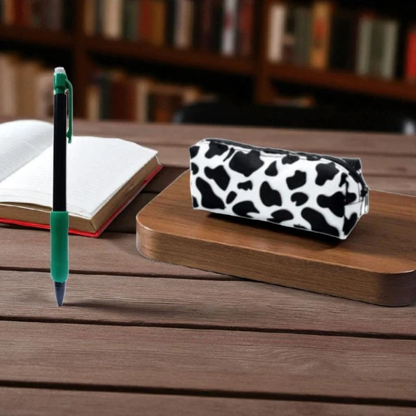İnek Desen Kalemlik - Okul Kalemliği-Makyaj Çantası ve Yeşil Uçlu Kalem Hediyeli