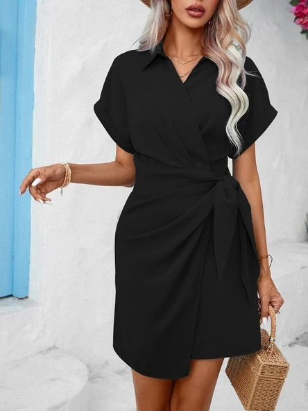 Kadın Kısa Kollu Yakalı Yandan Bağlamalı Dokuma Elbise