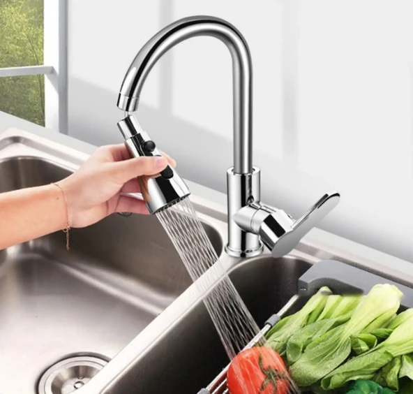 Krom 3 Fonksiyonlu Mutfak Lavabo Başlığı 360 Derece Döner Musluk Ucu