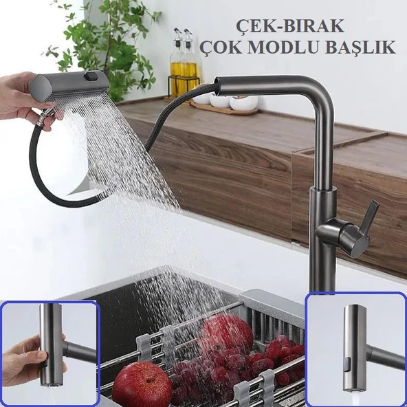 ÇOK MODLU INOX MUTFAK EVYE BATARYASI MAT GRİ MUSLUK SPİRALLİ ÇEK BIRAK BAŞLIK YAĞMURLAMA