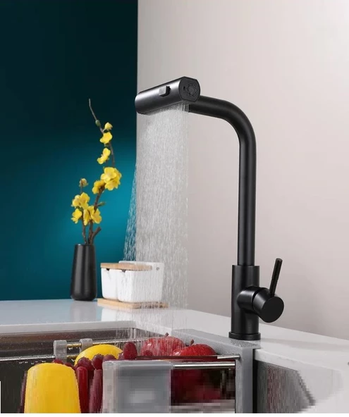 SİYAH SPİRALLİ MUTFAK EVYE BATARYASI ÇİFT MODLU TASARRUF FONKSİYONLU MAT SİYAH UZATMALI YENİ MODEL